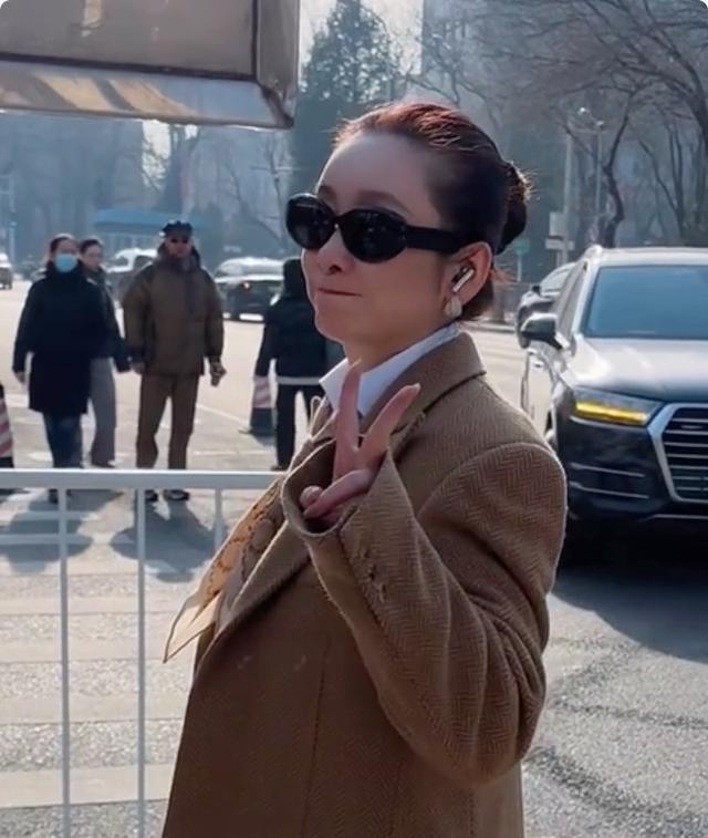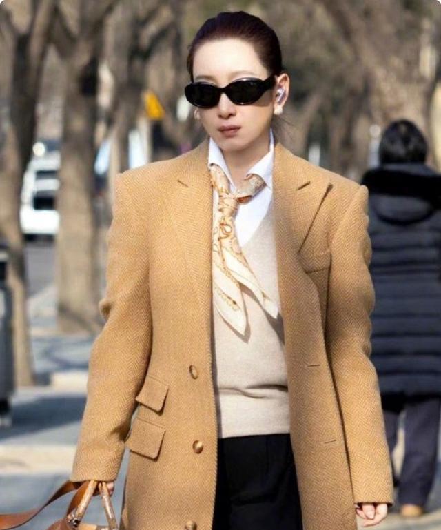 她一袭长款深色大衣裹身,利落的丸子头梳得一点不苟,脸上架着一副墨镜,迈步时裙摆带风,活脱脱等于从皆市剧里走出来的精英大女主。
