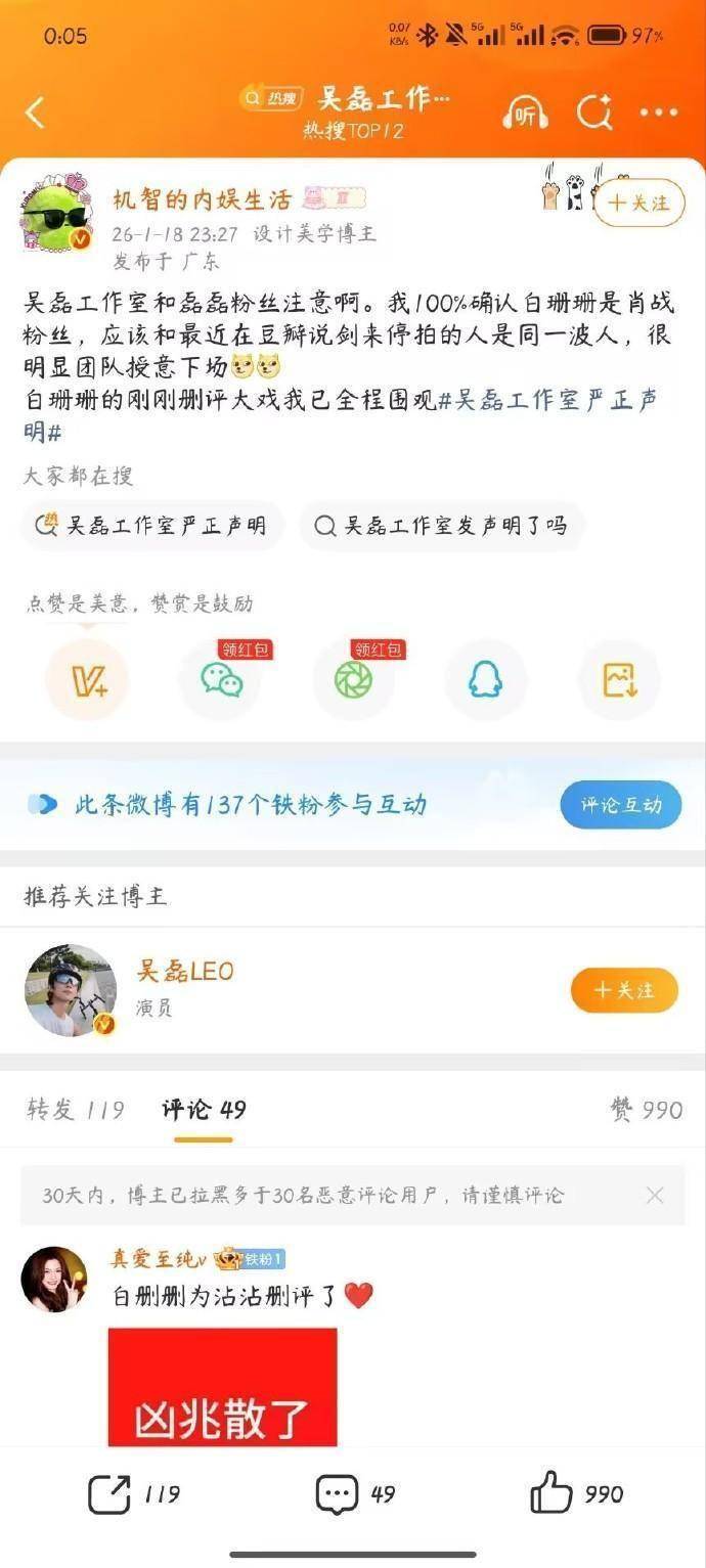 当今白珊珊的账号也曾停更,大部分爆料本色齐删了,只剩下被网友截图的 “黑历史”。而吴磊职责室的法律要害还在激动,《剑来》剧组拍戏也没受影响,吴磊本东说念主更是专心搞做事,根底没理这茬。