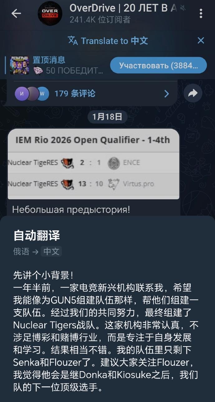虎扑01月18日讯 昨晚IEM里约欧洲区公开预选赛中,好意思妙之师Nuclear TigeRES连斩VP、ENCE晋级顽固式预选赛。OD示意这一波他建功,因为这支Nuclear TigeRES建队时他挑的东谈主!