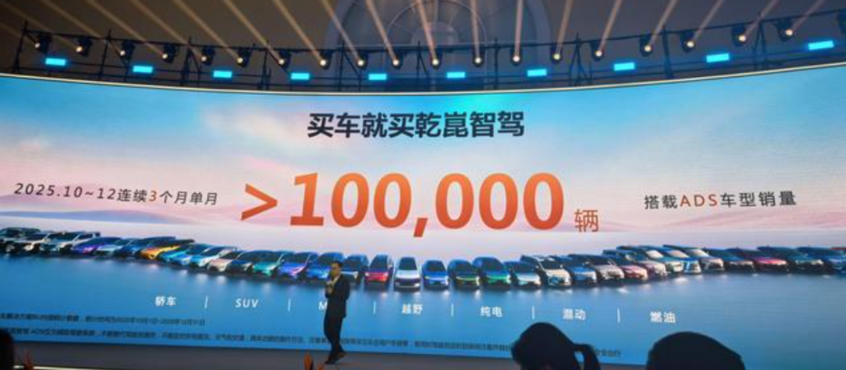 华为乾崑媒体现场公布了不少数据,比如2025年10月起,搭载乾崑智驾的车型单月销量已突破10万台,这一矫健势头将在2026年抓续,1月新增量仍稳超10万台,记号着华为智驾本领崇拜迈入限制化栽培的快车说念。