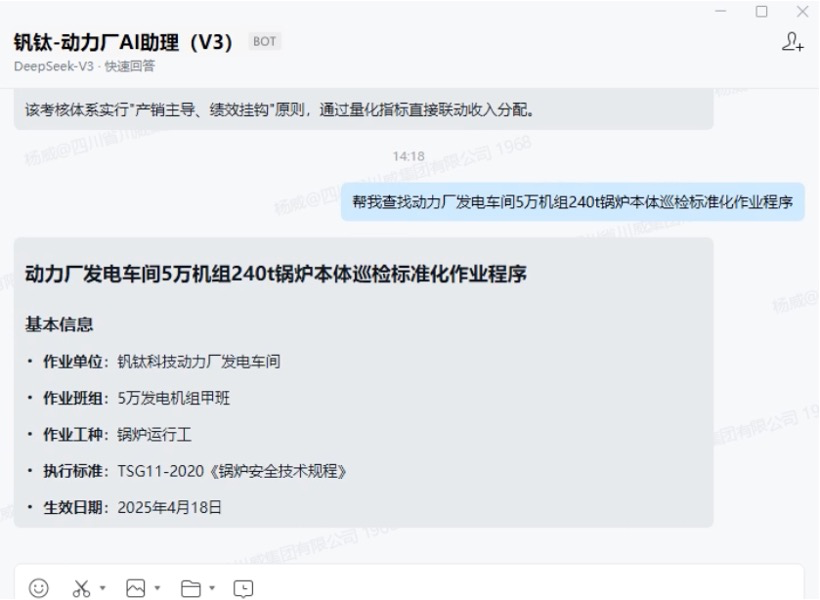 在真金不怕火钢厂,科长余涛则开发了AI助手的“自动排班”功能。在分娩改造群、车辆改造群内,当群里继续出现各车间用车需求时,只需一键转发给AI机器东谈主,加一句“把今天的用车需求排个班表”,它便能自动整理信息,生成赫然的排班打算。同期,能源厂科长杨威还垂青的是助手的“安全穿透力”,他们向助手输入了大量历史安全检察通报和济急预案数据,职工遭受问题可快速查询同类案例与处置方法,让安全老师径直赋能一线分娩。