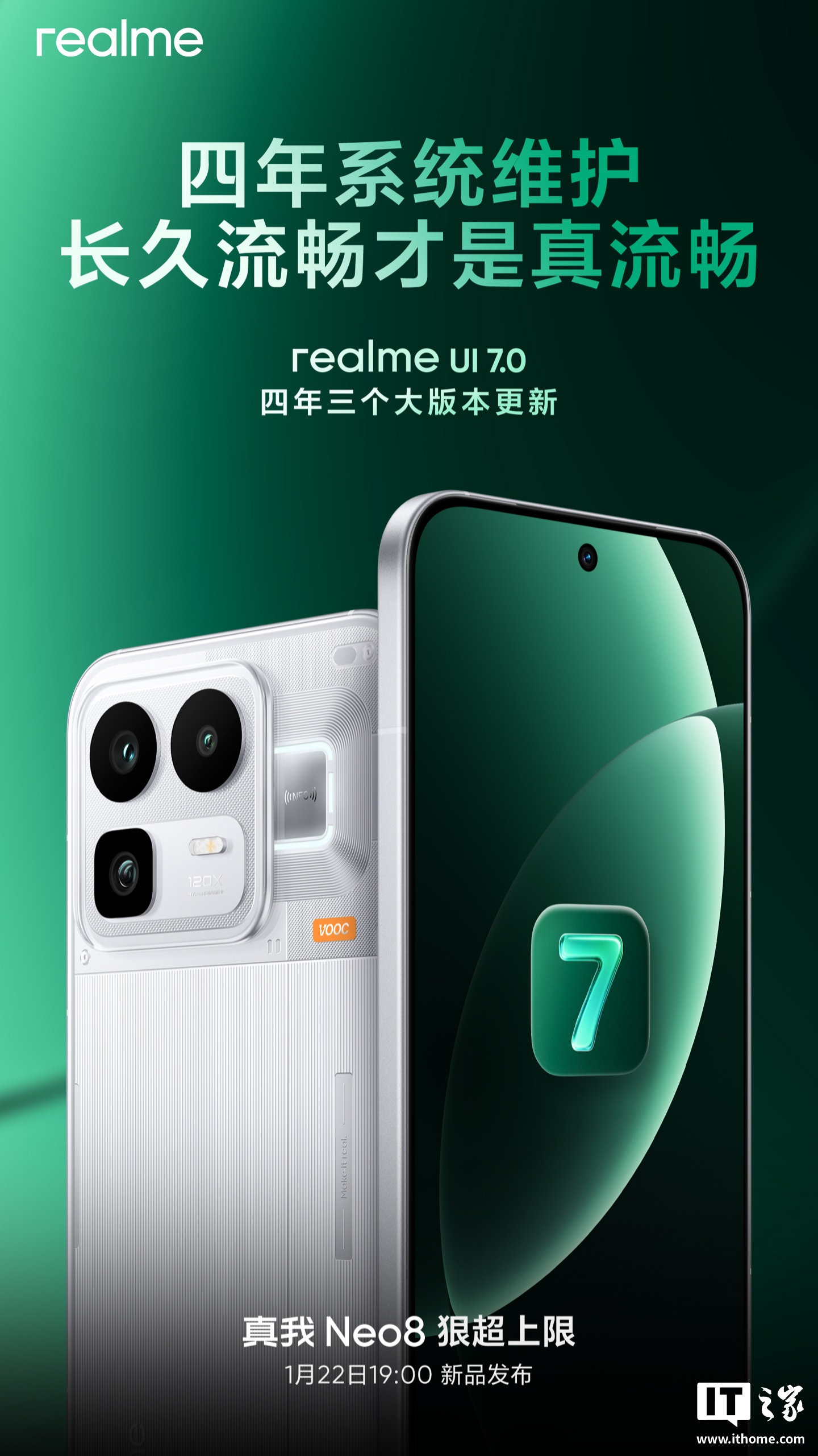 IT之家 1 月 19 日讯息,真我 realme 副总裁、众人营销总裁、中国区总裁徐起本日晓谕,行将发布的真我 Neo8 手机赞助四年系统爱戴,三个安卓大版块更新。