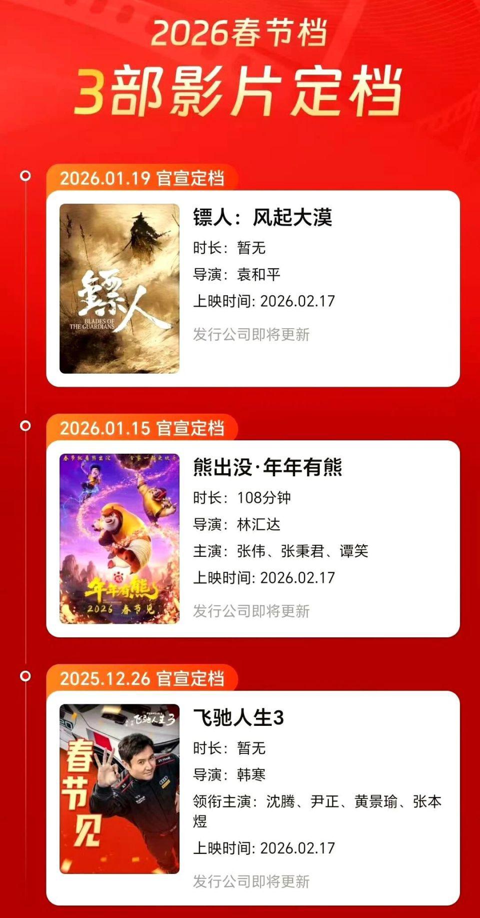 距离 2026 年春节档只剩不到一个月,电影阛阓的氛围却透着股反常的淡定。截止 1 月 19 日,惟一《疾驰东说念主生 3》《熊出没 · 年年有熊》《镖东说念主:风起大漠》三部影片认真官宣定档,且均锁定大年月朔(2 月 17 日),和客岁同时六部影片提前三个月扎堆官宣的干扰神志比较,本年的节拍慢得让东说念主焦灼。